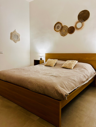 Chambre parentale de 16 m² disposant d'un confortable lit King Size, de 2 tables de nuit et d'une large commode à 6 tiroirs. La chambre est équipée de l'air conditionné et du wifi. La fenêtre, quant à elle, dispose d'un volet et d'un moustiquaire.